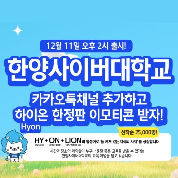 안녕하세요~ 한양사이버대학교입니다. 한양사이버대학교의 상징 캐릭터 하이온(Hyon) 이 드디어 이모티콘으로 탄생했습니다! 오는 12월 11일(목) 오후 2시 공식 카카오톡 채널에서 선착순 25,000명에게 무료로 배포될 예정이라니, 놓치면 아쉬운 이벤트죠! 하이온(Hyon)은 누구? 하이온은 HY(Hanyang) + On(온라인·활성화) + Lion(사자) 를 조합해 만든 이름으로,“늘 켜져 있는 지식의 사자”, 언제 어디서나 열려 있는 교육을 상징합니다. 따뜻하면서도 열정적인 한양사이버대의 교육 철학을 담아 탄생한 마스코트예요. ✨ 총 16종! 일상에서 딱 쓰기 좋은 표현들 이번 이모티콘 세트는 축하, 열공, 파이팅, 고마워요 등 학생들도, 일반 사.......